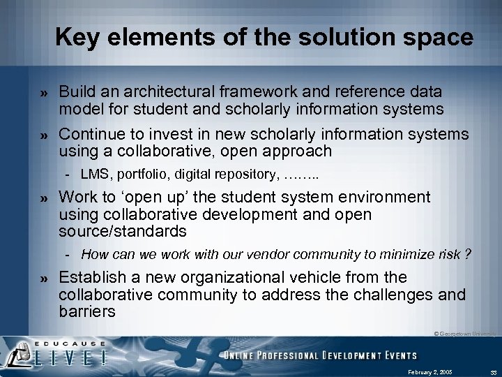 Key elements of the solution space » Build an architectural framework and reference data model for student and scholarly information systems » Continue to invest in new scholarly information systems using a collaborative, open approach - LMS, portfolio, digital repository, ……. . » Work to ‘open up’ the student system environment using collaborative development and open source/standards - How can we work with our vendor community to minimize risk ? » Establish a new organizational vehicle from the collaborative community to address the challenges and barriers © Georgetown University February 2, 2005 33