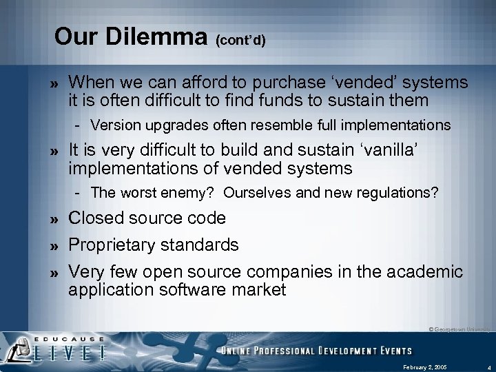 The Systems Dilemma » The software market is not focused on higher education goals and needs - Many feel the higher ed market is too small to sustain a healthy vendor environment » New uncertainties in the commercial vendor space - Emerging consolidations - Depressed investment climate - Migration away from products toward services © Georgetown University February 2, 2005 3