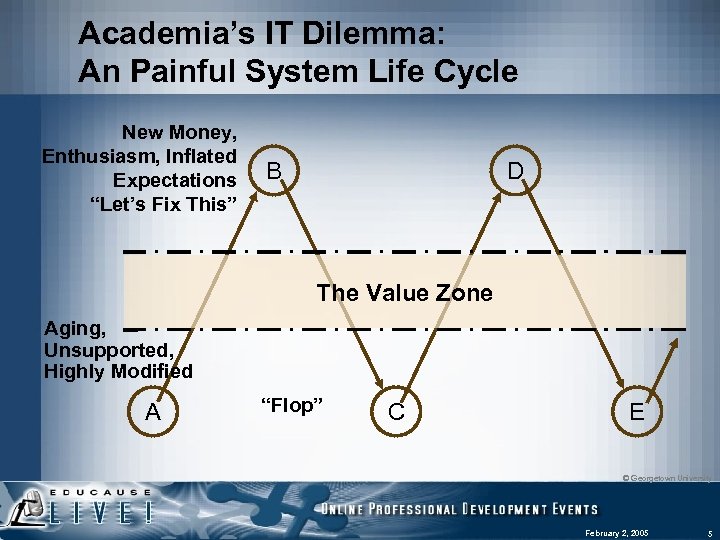 Academia’s IT Dilemma: An Painful System Life Cycle New Money, Enthusiasm, Inflated Expectations “Let’s Fix This” B D The Value Zone Aging, Unsupported, Highly Modified A “Flop” C E © Georgetown University February 2, 2005 5