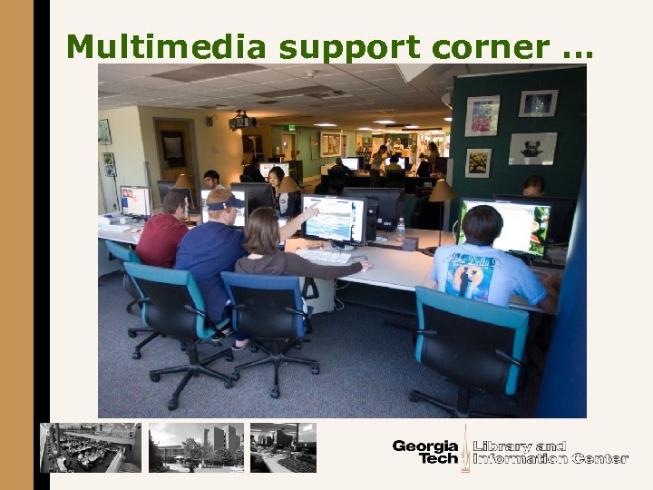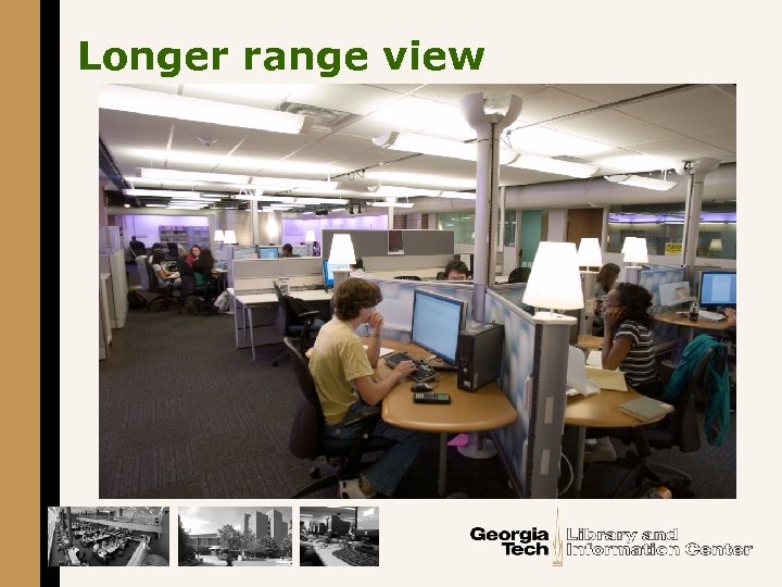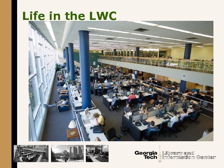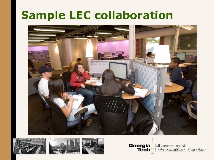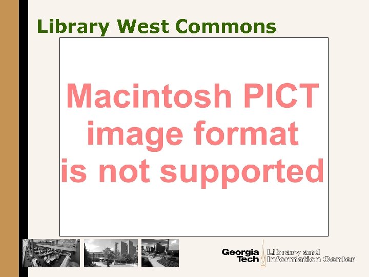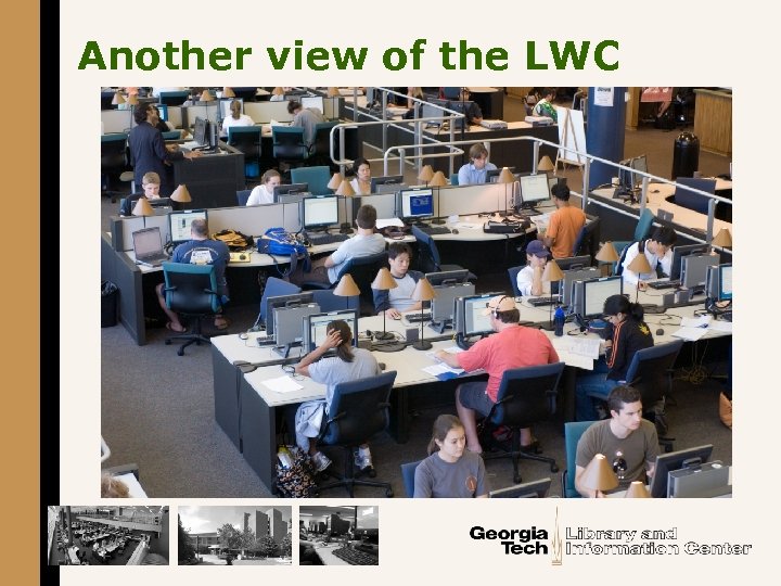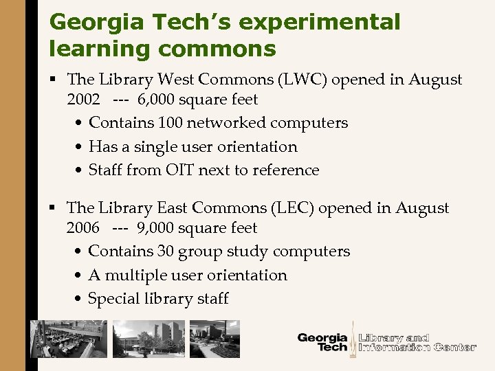 Georgia Tech’s experimental learning commons § The Library West Commons (LWC) opened in August 2002 --- 6, 000 square feet • Contains 100 networked computers • Has a single user orientation • Staff from OIT next to reference § The Library East Commons (LEC) opened in August 2006 --- 9, 000 square feet • Contains 30 group study computers • A multiple user orientation • Special library staff