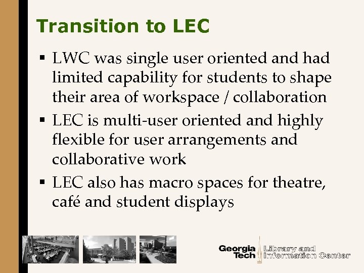 Transition to LEC § LWC was single user oriented and had limited capability for students to shape their area of workspace / collaboration § LEC is multi-user oriented and highly flexible for user arrangements and collaborative work § LEC also has macro spaces for theatre, café and student displays