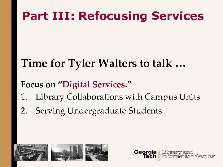 Part III: Refocusing Services Time for Tyler Walters to talk … Focus on “Digital Services: ” 1. Library Collaborations with Campus Units 2. Serving Undergraduate Students