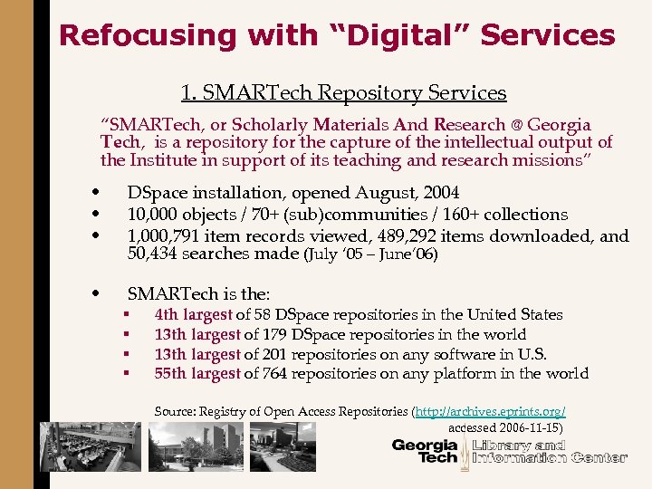 Refocusing with “Digital” Services 1. SMARTech Repository Services “SMARTech, or Scholarly Materials And Research @ Georgia Tech, is a repository for the capture of the intellectual output of the Institute in support of its teaching and research missions” • • • DSpace installation, opened August, 2004 10, 000 objects / 70+ (sub)communities / 160+ collections 1, 000, 791 item records viewed, 489, 292 items downloaded, and 50, 434 searches made (July ‘ 05 – June’ 06) • SMARTech is the: § § 4 th largest of 58 DSpace repositories in the United States 13 th largest of 179 DSpace repositories in the world 13 th largest of 201 repositories on any software in U. S. 55 th largest of 764 repositories on any platform in the world Source: Registry of Open Access Repositories (http: //archives. eprints. org/ accessed 2006 -11 -15)