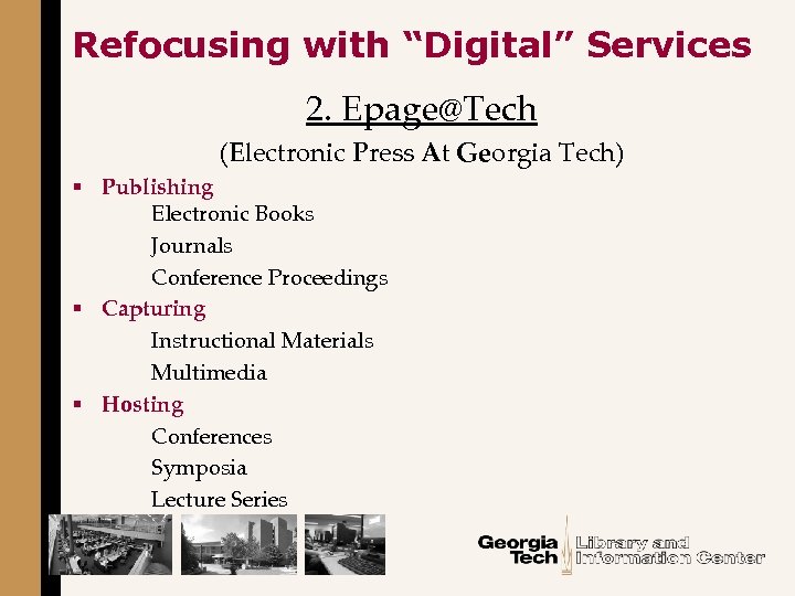 Refocusing with “Digital” Services 2. Epage@Tech (Electronic Press At Georgia Tech) § Publishing Electronic Books Journals Conference Proceedings § Capturing Instructional Materials Multimedia § Hosting Conferences Symposia Lecture Series
