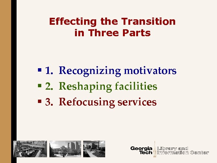 Effecting the Transition in Three Parts § 1. Recognizing motivators § 2. Reshaping facilities § 3. Refocusing services