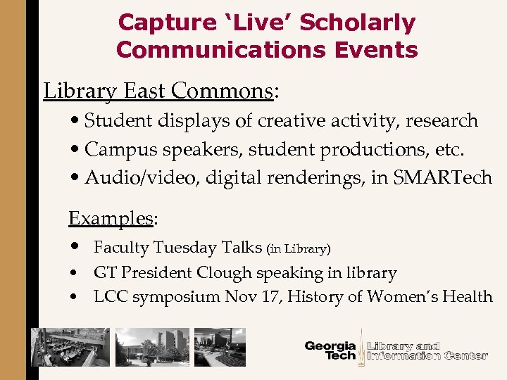 Capture ‘Live’ Scholarly Communications Events Library East Commons: • Student displays of creative activity, research • Campus speakers, student productions, etc. • Audio/video, digital renderings, in SMARTech Examples: • Faculty Tuesday Talks (in Library) • GT President Clough speaking in library • LCC symposium Nov 17, History of Women’s Health