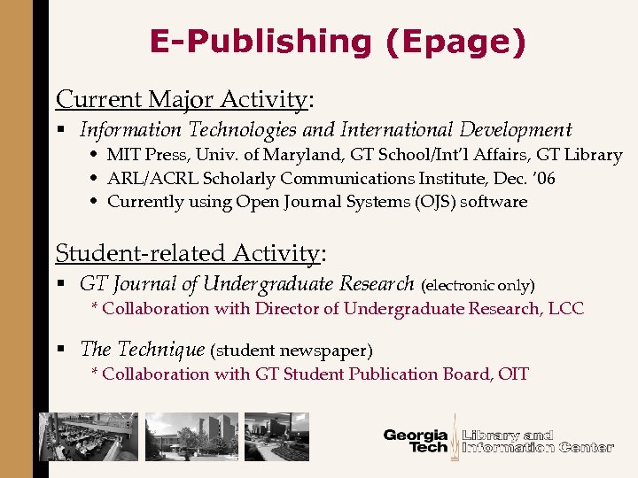 E-Publishing (Epage) Current Major Activity: § Information Technologies and International Development • MIT Press, Univ. of Maryland, GT School/Int’l Affairs, GT Library • ARL/ACRL Scholarly Communications Institute, Dec. ’ 06 • Currently using Open Journal Systems (OJS) software Student-related Activity: § GT Journal of Undergraduate Research (electronic only) * Collaboration with Director of Undergraduate Research, LCC § The Technique (student newspaper) * Collaboration with GT Student Publication Board, OIT