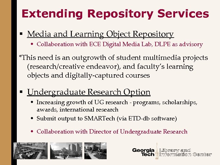 Extending Repository Services § Media and Learning Object Repository • Collaboration with ECE Digital Media Lab, DLPE as advisory *This need is an outgrowth of student multimedia projects (research/creative endeavor), and faculty’s learning objects and digitally-captured courses § Undergraduate Research Option • Increasing growth of UG research - programs, scholarships, awards, international research • Submit output to SMARTech (via ETD-db software) • Collaboration with Director of Undergraduate Research