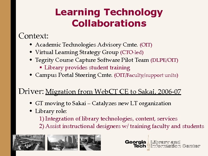 Learning Technology Collaborations Context: • Academic Technologies Advisory Cmte. (OIT) • Virtual Learning Strategy Group (CTO-led) • Tegrity Course Capture Software Pilot Team (DLPE/OIT) § Library provides student training • Campus Portal Steering Cmte. (OIT/Faculty/support units) Driver: Migration from Web. CT CE to Sakai, 2006 -07 • GT moving to Sakai – Catalyzes new LT organization • Library role: 1) Integration of library technologies, content, services 2) Assist instructional designers w/ training faculty and students