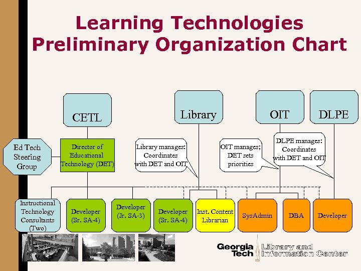 Learning Technologies Preliminary Organization Chart Library CETL Ed Tech Steering Group Instructional Technology Consultants (Two) Director of Educational Technology (DET) Developer (Sr. SA-4) Library manages: Coordinates with DET and OIT Developer (Jr. SA-3) Developer (Sr. SA-4) OIT manages; DET sets priorities Inst. Content Librarian Sys. Admin DLPE manages: Coordinates with DET and OIT DBA Developer