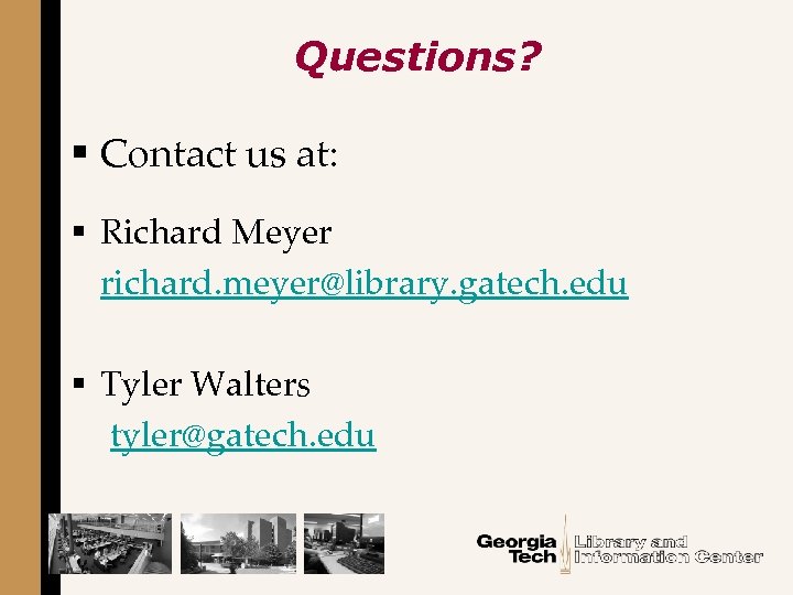Questions? § Contact us at: § Richard Meyer richard. meyer@library. gatech. edu § Tyler Walters tyler@gatech. edu