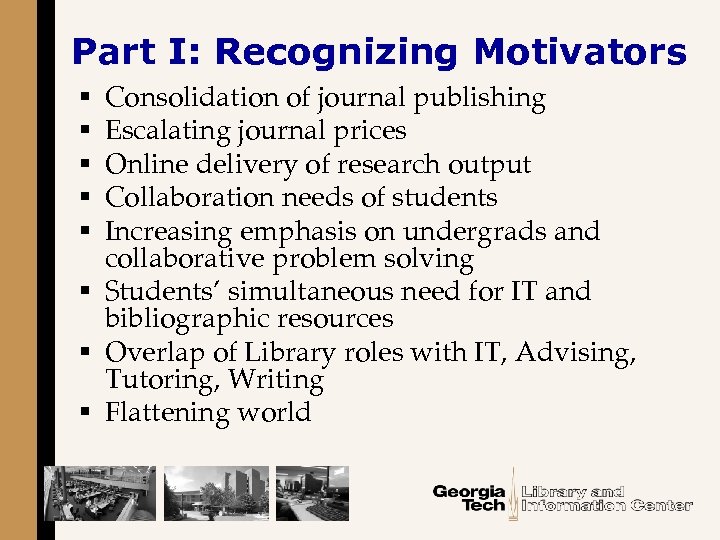 Part I: Recognizing Motivators Consolidation of journal publishing Escalating journal prices Online delivery of research output Collaboration needs of students Increasing emphasis on undergrads and collaborative problem solving § Students’ simultaneous need for IT and bibliographic resources § Overlap of Library roles with IT, Advising, Tutoring, Writing § Flattening world § § §