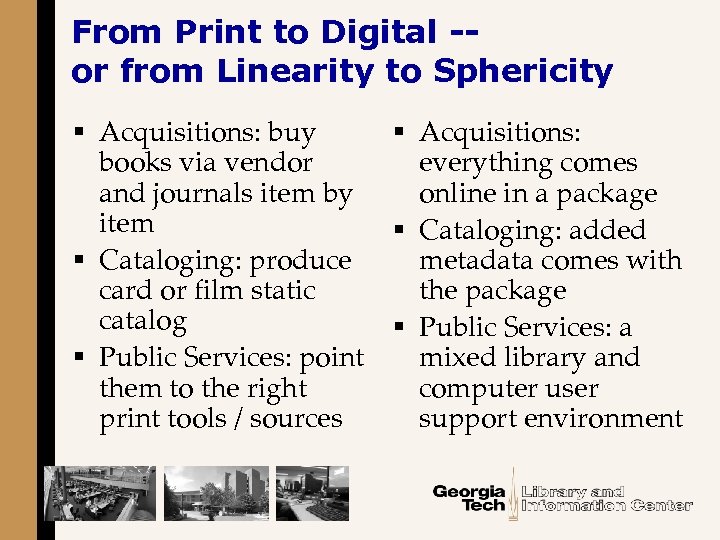 From Print to Digital -or from Linearity to Sphericity § Acquisitions: buy § Acquisitions: books via vendor everything comes and journals item by online in a package item § Cataloging: added § Cataloging: produce metadata comes with card or film static the package catalog § Public Services: a § Public Services: point mixed library and them to the right computer user print tools / sources support environment