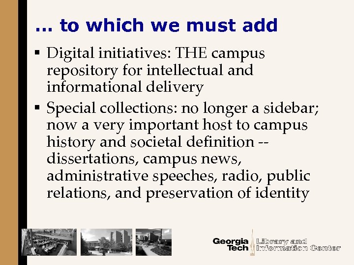 … to which we must add § Digital initiatives: THE campus repository for intellectual and informational delivery § Special collections: no longer a sidebar; now a very important host to campus history and societal definition -dissertations, campus news, administrative speeches, radio, public relations, and preservation of identity