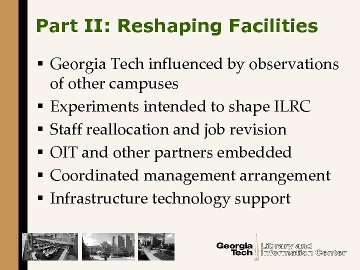Part II: Reshaping Facilities § Georgia Tech influenced by observations of other campuses § Experiments intended to shape ILRC § Staff reallocation and job revision § OIT and other partners embedded § Coordinated management arrangement § Infrastructure technology support