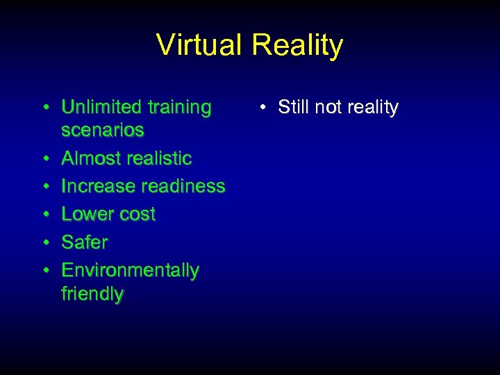 Virtual Reality • Unlimited training scenarios • Almost realistic • Increase readiness • Lower cost • Safer • Environmentally friendly • Still not reality