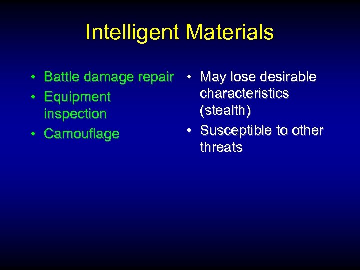 Intelligent Materials • Battle damage repair • May lose desirable characteristics • Equipment (stealth) inspection • Susceptible to other • Camouflage threats