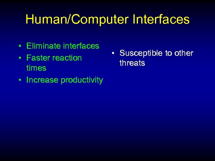 Human/Computer Interfaces • Eliminate interfaces • Susceptible to other • Faster reaction threats times • Increase productivity
