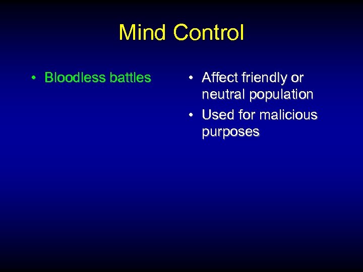 Mind Control • Bloodless battles • Affect friendly or neutral population • Used for malicious purposes