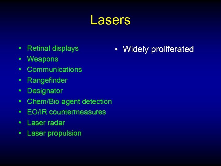 Lasers • • • Retinal displays • Widely proliferated Weapons Communications Rangefinder Designator Chem/Bio agent detection EO/IR countermeasures Laser radar Laser propulsion