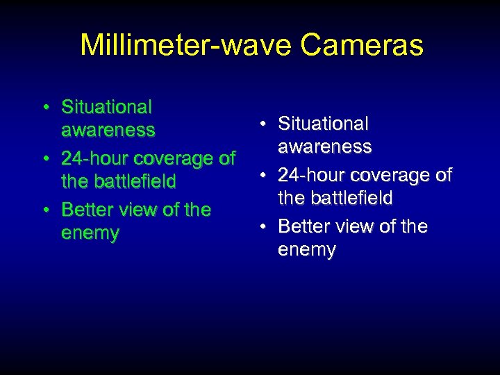 Millimeter-wave Cameras • Situational awareness • 24 -hour coverage of the battlefield • Better view of the enemy