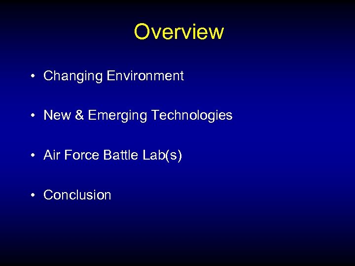 Overview • Changing Environment • New & Emerging Technologies • Air Force Battle Lab(s) • Conclusion