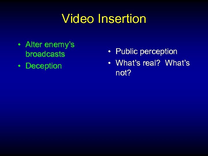 Video Insertion • Alter enemy’s broadcasts • Deception • Public perception • What’s real? What’s not?