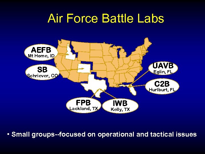 Air Force Battle Labs AEFB Mt Home, ID UAVB SB Eglin, FL Schriever, CO C 2 B Hurlburt, FL FPB Lackland, TX IWB Kelly, TX • Small groups--focused on operational and tactical issues