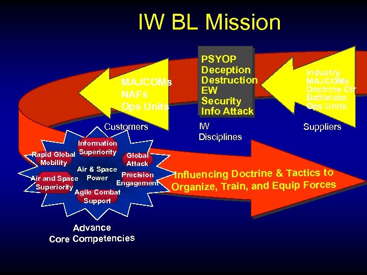 IW BL Mission MAJCOMs NAFs Ops Units Customers Information Rapid Global Superiority Global Mobility Attack Air & Space Precision Air and Space Power Engagement Superiority Agile Combat Support Advance Core Competencies PSYOP Deception Destruction EW Security Info Attack IW Disciplines Industry MAJCOMs Doctrine Ctr Battlelabs Ops Units Suppliers Influencing Doctrine & Tactics to Organize, Train, and Equip Forces