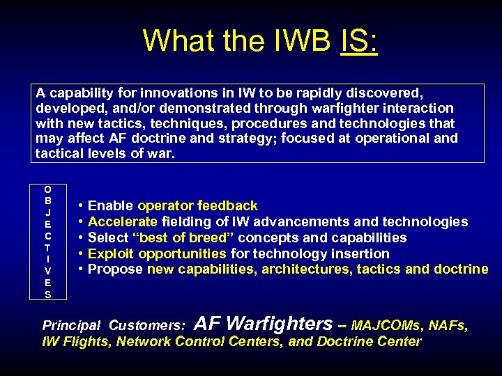 What the IWB IS: A capability for innovations in IW to be rapidly discovered, developed, and/or demonstrated through warfighter interaction with new tactics, techniques, procedures and technologies that may affect AF doctrine and strategy; focused at operational and tactical levels of war. O B J E C T I V E S • Enable operator feedback • Accelerate fielding of IW advancements and technologies • Select “best of breed” concepts and capabilities • Exploit opportunities for technology insertion • Propose new capabilities, architectures, tactics and doctrine Principal Customers: AF Warfighters -- MAJCOMs, NAFs, IW Flights, Network Control Centers, and Doctrine Center