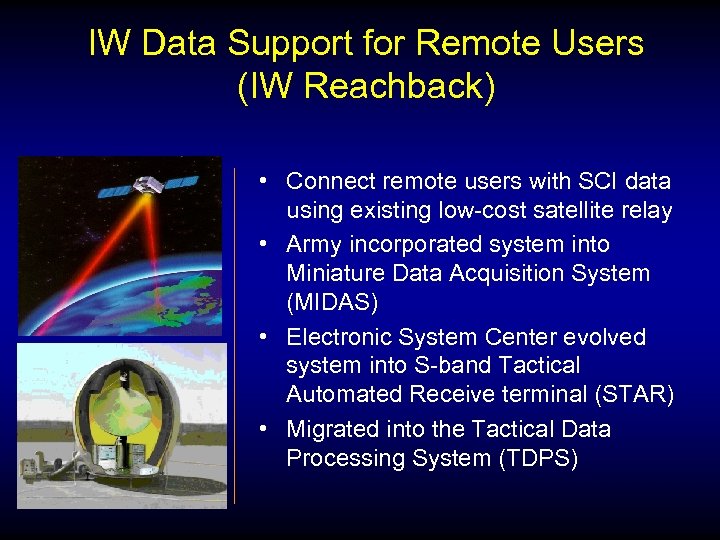 IW Data Support for Remote Users (IW Reachback) • Connect remote users with SCI data using existing low-cost satellite relay • Army incorporated system into Miniature Data Acquisition System (MIDAS) • Electronic System Center evolved system into S-band Tactical Automated Receive terminal (STAR) • Migrated into the Tactical Data Processing System (TDPS)