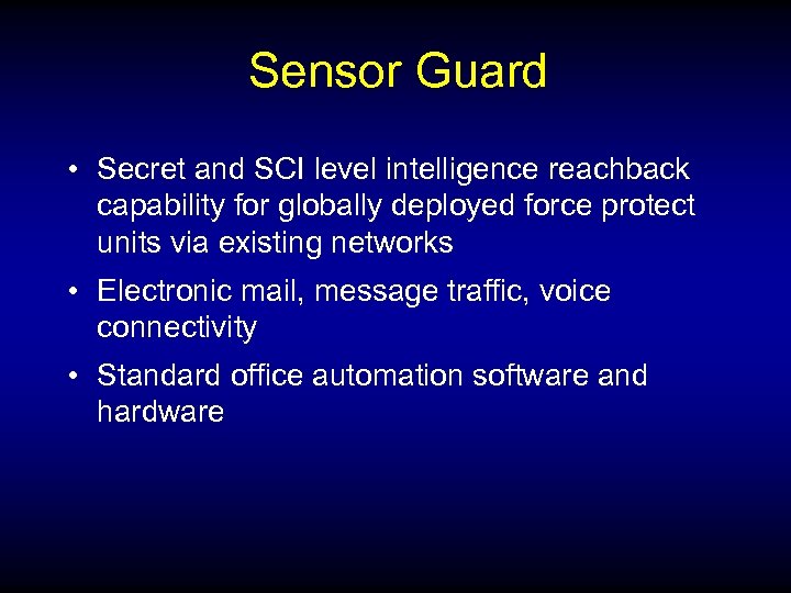 Sensor Guard • Secret and SCI level intelligence reachback capability for globally deployed force protect units via existing networks • Electronic mail, message traffic, voice connectivity • Standard office automation software and hardware