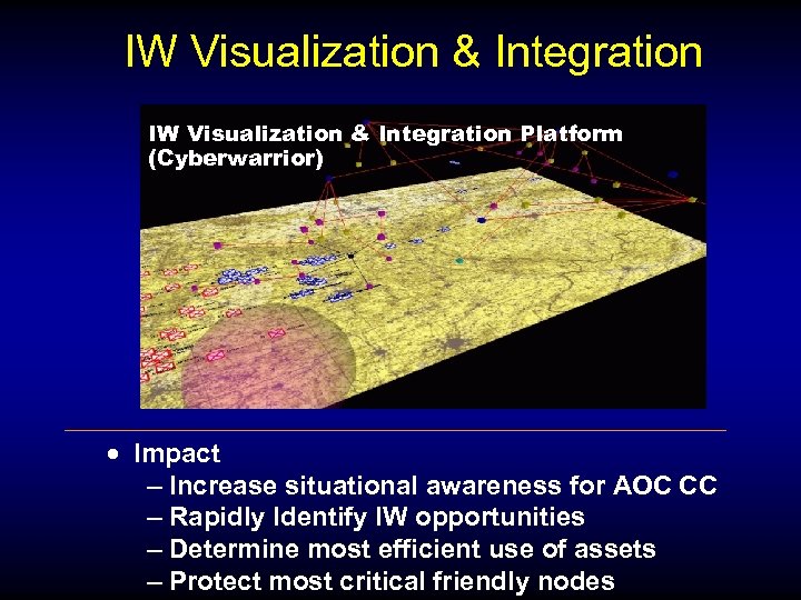 IW Visualization & Integration Platform (Cyberwarrior) · Impact – Increase situational awareness for AOC CC – Rapidly Identify IW opportunities – Determine most efficient use of assets – Protect most critical friendly nodes