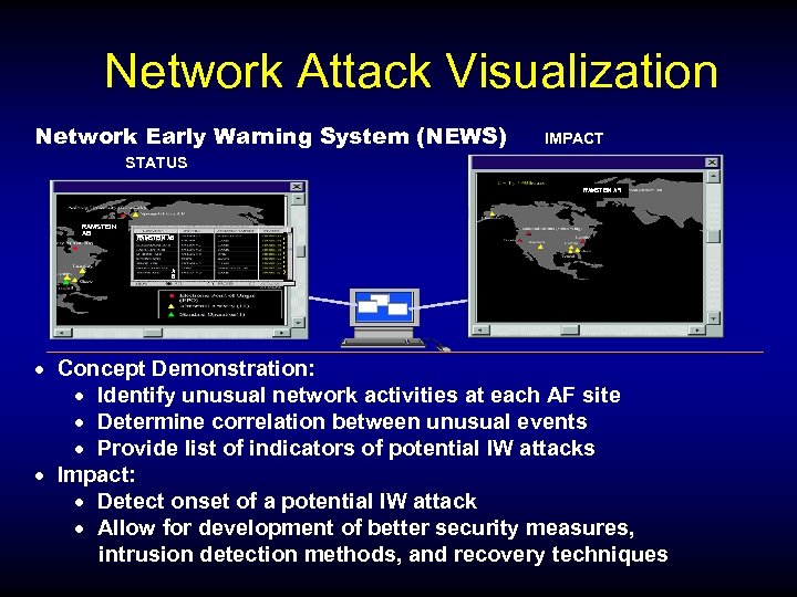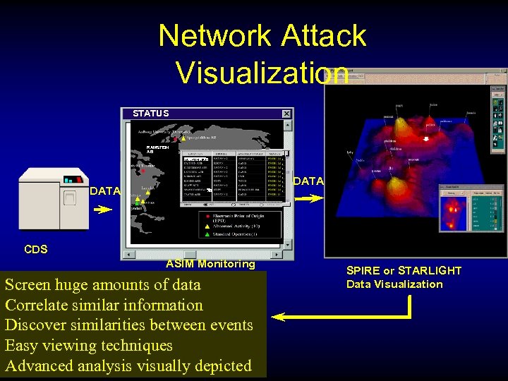 Network Attack Visualization STATUS RAMSTEIN AB LOCATION PROFILE ASSESSED TARGET STATUS RAMSTEIN AB AB RAMSTEIN ADMIN LAN PROBE (e) RSCAN ASIM v. 2 CAMS PROBE (e) ELMENDORF AFB CAMS PROBE (e) LANGLEY AFB ASIM v. 2 CAMS PROBE (e) M. HOME AFB ASIM v. 2 UNK PROBE (e) ROBINS AFB DATA ASIM v. 2 CANNON AFB COPS WCCS PROBE (e) SHAW AFB ASIM v. 2 CAMS PROBE (e) PERSONNEL DB PROBE (e) CAMS PROBE (i) SPANGDAHLEM AB COPS AB TRAVIS AFB SHOW ASIM v. 2 ALL PROBES DATA ATTACKS CDS ASIM Monitoring Screen huge amounts of data Correlate similar information Discover similarities between events Easy viewing techniques Advanced analysis visually depicted SPIRE or STARLIGHT Data Visualization