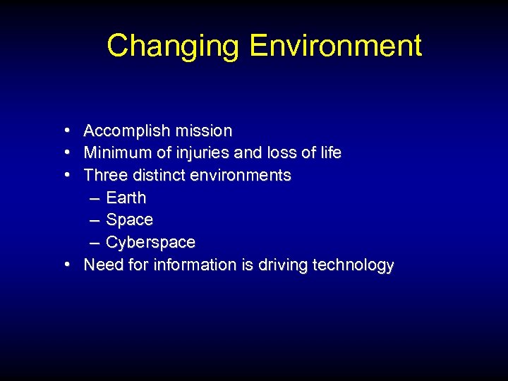 Changing Environment • • • Accomplish mission Minimum of injuries and loss of life Three distinct environments – Earth – Space – Cyberspace • Need for information is driving technology