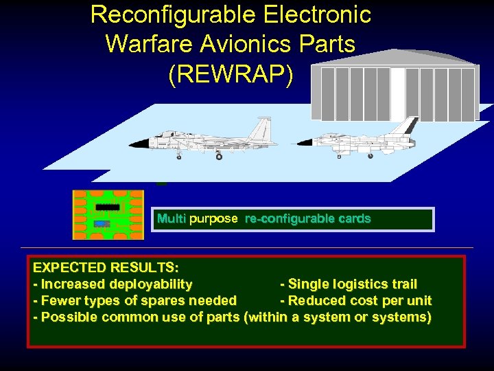 Reconfigurable Electronic Warfare Avionics Parts (REWRAP) Multi purpose re-configurable cards EXPECTED RESULTS: - Increased deployability - Single logistics trail - Fewer types of spares needed - Reduced cost per unit - Possible common use of parts (within a system or systems)