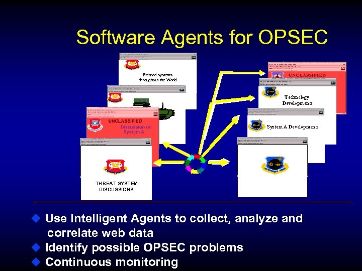 Software Agents for OPSEC UNCLASSIFIED Related systems throughout the World UNCLASSIFIED on UNCLASSIFIED Discussion System A UNCLASSIFIED THREAT SYSTEM DISCUSSIONS UNCLASSIFIED CHAT ROOM UNCLASSIFIED Technology Developments UNCLASSIFIED System A Developments UNCLASSIFIED u Use Intelligent Agents to collect, analyze and correlate web data u Identify possible OPSEC problems u Continuous monitoring