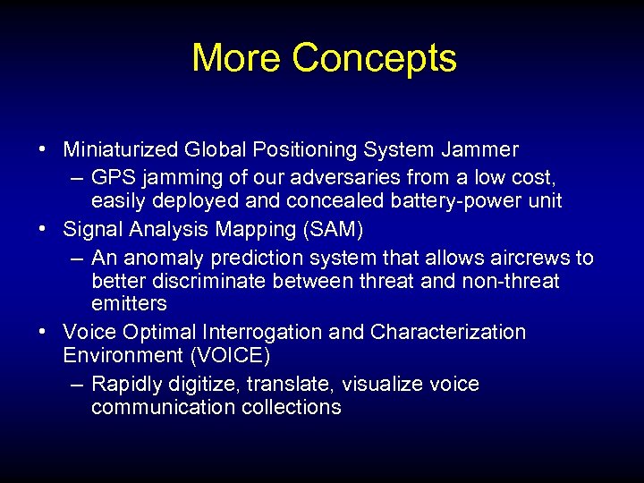 More Concepts • Miniaturized Global Positioning System Jammer – GPS jamming of our adversaries from a low cost, easily deployed and concealed battery-power unit • Signal Analysis Mapping (SAM) – An anomaly prediction system that allows aircrews to better discriminate between threat and non-threat emitters • Voice Optimal Interrogation and Characterization Environment (VOICE) – Rapidly digitize, translate, visualize voice communication collections