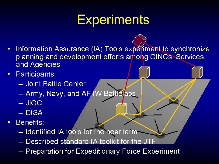 Experiments • Information Assurance (IA) Tools experiment to synchronize planning and development efforts among CINCs, Services, and Agencies • Participants: – Joint Battle Center – Army, Navy, and AF IW Battlelabs – JIOC – DISA • Benefits: – Identified IA tools for the near term – Described standard IA toolkit for the JTF – Preparation for Expeditionary Force Experiment