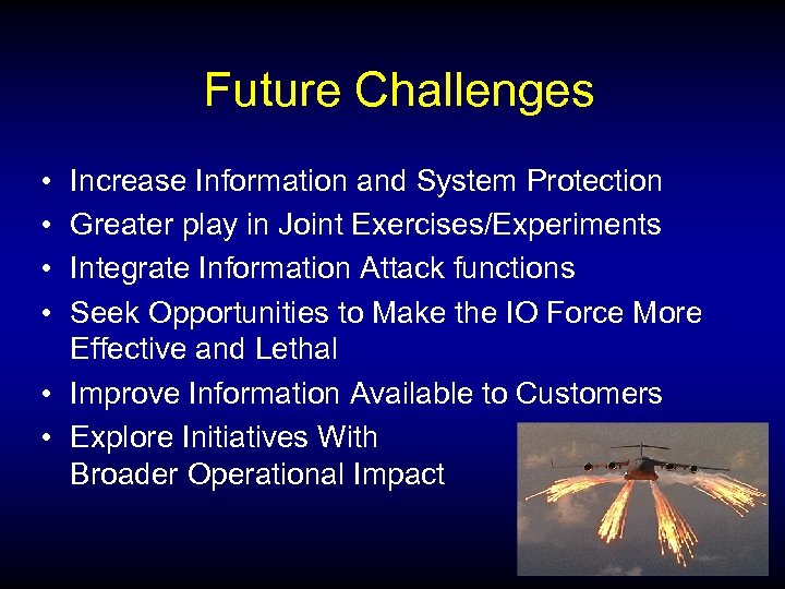 Future Challenges • • Increase Information and System Protection Greater play in Joint Exercises/Experiments Integrate Information Attack functions Seek Opportunities to Make the IO Force More Effective and Lethal • Improve Information Available to Customers • Explore Initiatives With Broader Operational Impact