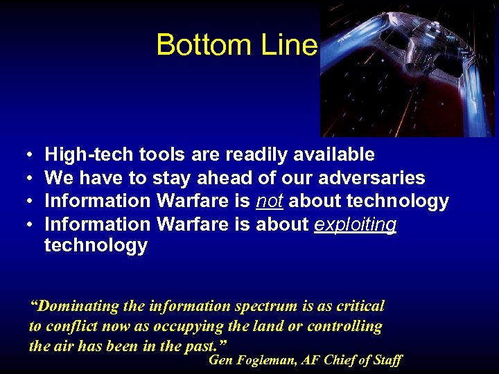 Bottom Line • • High-tech tools are readily available We have to stay ahead of our adversaries Information Warfare is not about technology Information Warfare is about exploiting technology “Dominating the information spectrum is as critical to conflict now as occupying the land or controlling the air has been in the past. ” Gen Fogleman, AF Chief of Staff