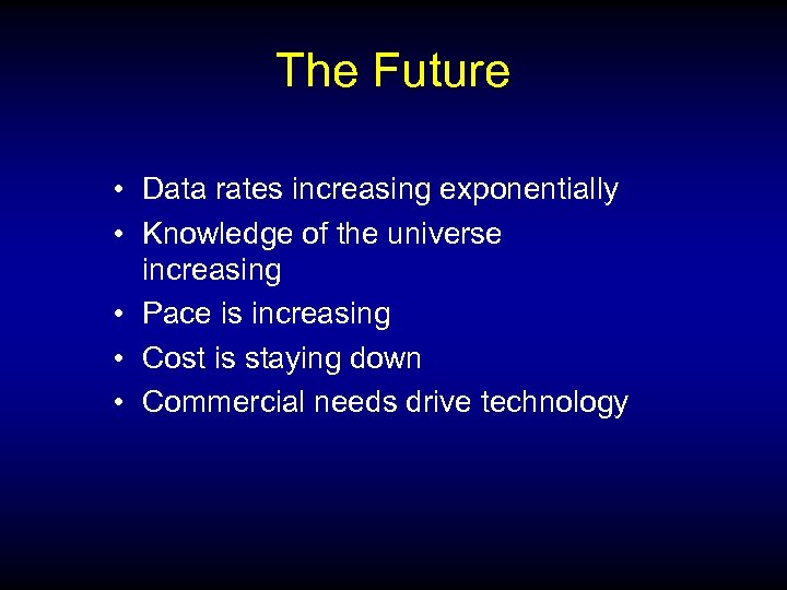 The Future • Data rates increasing exponentially • Knowledge of the universe increasing • Pace is increasing • Cost is staying down • Commercial needs drive technology