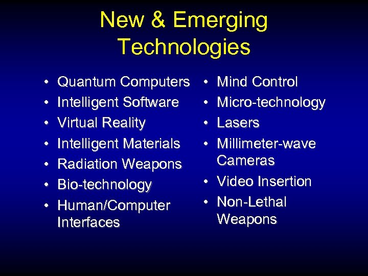 New & Emerging Technologies • • Quantum Computers Intelligent Software Virtual Reality Intelligent Materials Radiation Weapons Bio-technology Human/Computer Interfaces • • Mind Control Micro-technology Lasers Millimeter-wave Cameras • Video Insertion • Non-Lethal Weapons