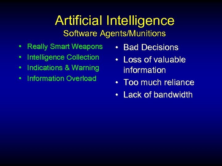 Artificial Intelligence Software Agents/Munitions • • Really Smart Weapons Intelligence Collection Indications & Warning Information Overload • Bad Decisions • Loss of valuable information • Too much reliance • Lack of bandwidth