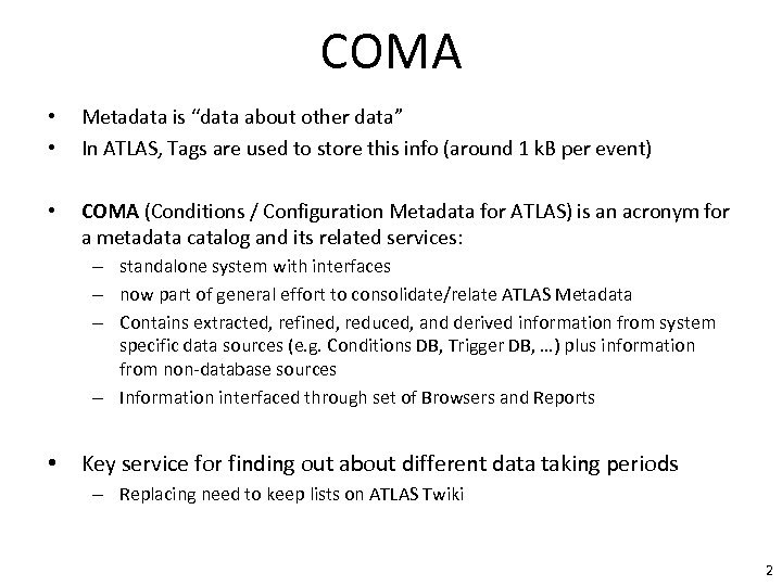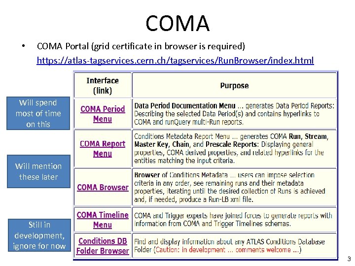 COMA • • Metadata is “data about other data” In ATLAS, Tags are used to store this info (around 1 k. B per event) • COMA (Conditions / Configuration Metadata for ATLAS) is an acronym for a metadata catalog and its related services: – standalone system with interfaces – now part of general effort to consolidate/relate ATLAS Metadata – Contains extracted, refined, reduced, and derived information from system specific data sources (e. g. Conditions DB, Trigger DB, …) plus information from non-database sources – Information interfaced through set of Browsers and Reports • Key service for finding out about different data taking periods – Replacing need to keep lists on ATLAS Twiki 2