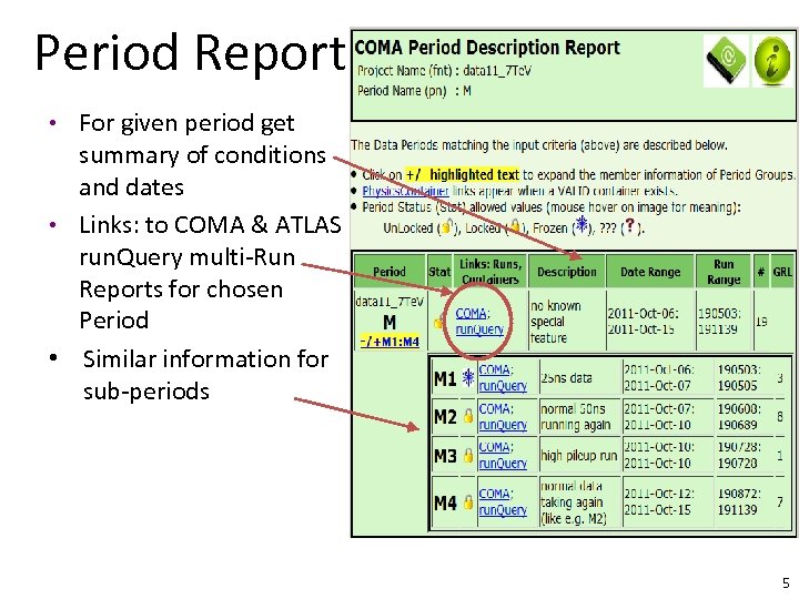 Period Menu • • Menu Purpose: Show Data Preparation defined Periods giving links to reports of general info about their Runs Choose the Period of interest: à à • • By Year (e. g. all ‘ 2010’) By Project (e. g. ‘data 10_7 Te. V’) By specific Period or Group Click on the project and then Period of interest Help page Clicking on any of the highlighted links brings up Period report Wildcards can be entered in this optional section, then click on Submit button Very fast way of getting Period info 4