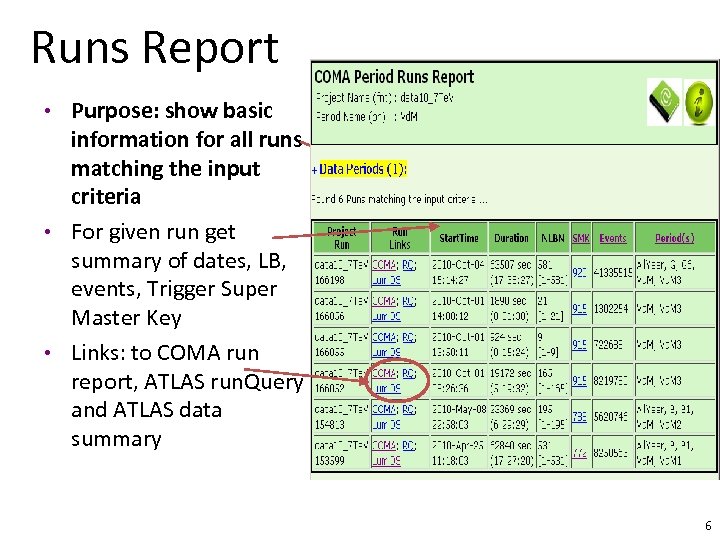 Period Report • For given period get summary of conditions and dates • Links: to COMA & ATLAS run. Query multi-Run Reports for chosen Period • Similar information for sub-periods 5
