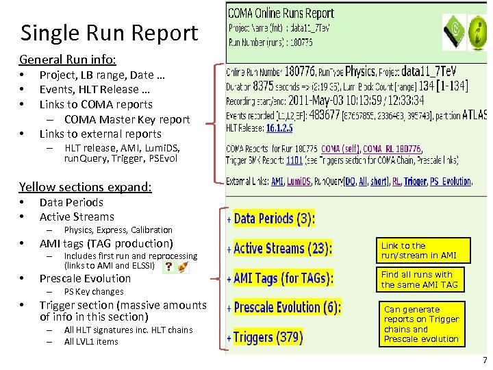 Runs Report • Purpose: show basic information for all runs matching the input criteria • For given run get summary of dates, LB, events, Trigger Super Master Key • Links: to COMA run report, ATLAS run. Query and ATLAS data summary 6