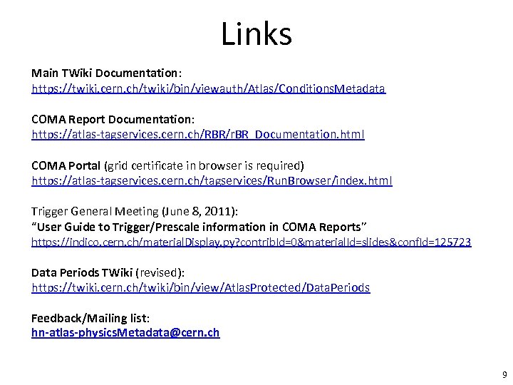 Links Main TWiki Documentation: https: //twiki. cern. ch/twiki/bin/viewauth/Atlas/Conditions. Metadata COMA Report Documentation: https: //atlas-tagservices. cern. ch/RBR/r. BR_Documentation. html COMA Portal (grid certificate in browser is required) https: //atlas-tagservices. cern. ch/tagservices/Run. Browser/index. html Trigger General Meeting (June 8, 2011): “User Guide to Trigger/Prescale information in COMA Reports” https: //indico. cern. ch/material. Display. py? contrib. Id=0&material. Id=slides&conf. Id=125723 Data Periods TWiki (revised): https: //twiki. cern. ch/twiki/bin/view/Atlas. Protected/Data. Periods Feedback/Mailing list: hn-atlas-physics. Metadata@cern. ch 9