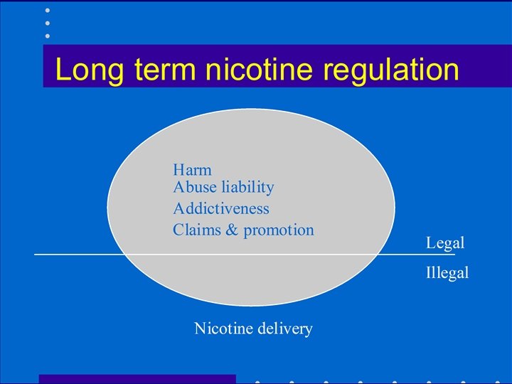 Harm reduction approaches • Least harmful, most beneficial products most stringently regulated • Most toxic, lethal products (cigarettes) are hardly regulated at all • Regulation is upside down
